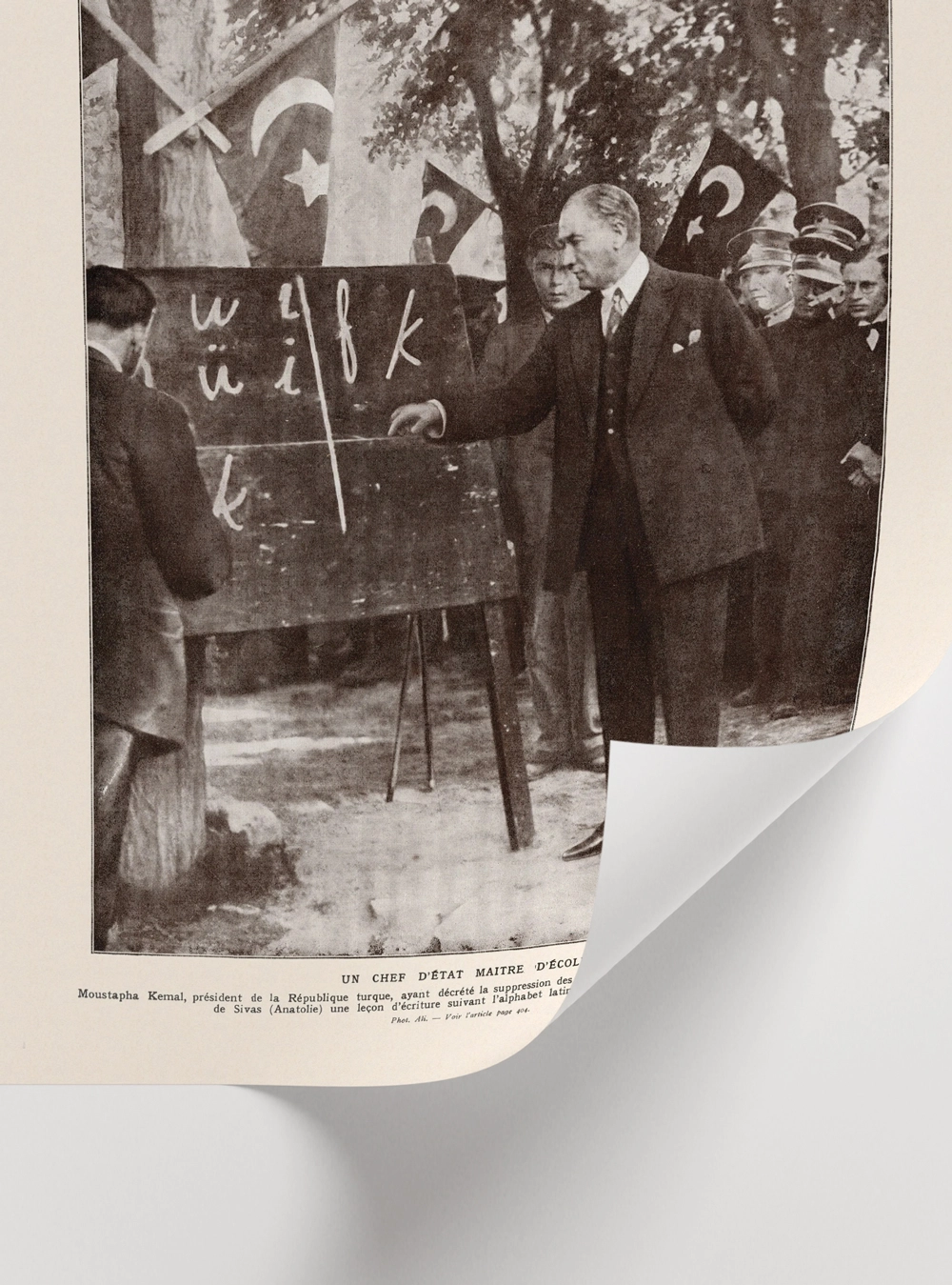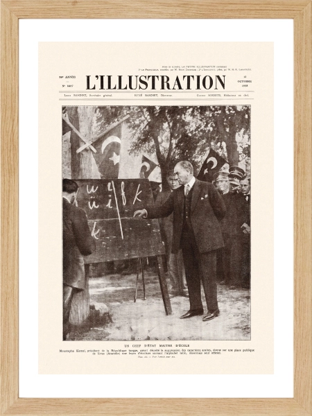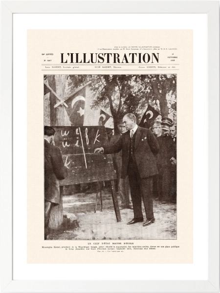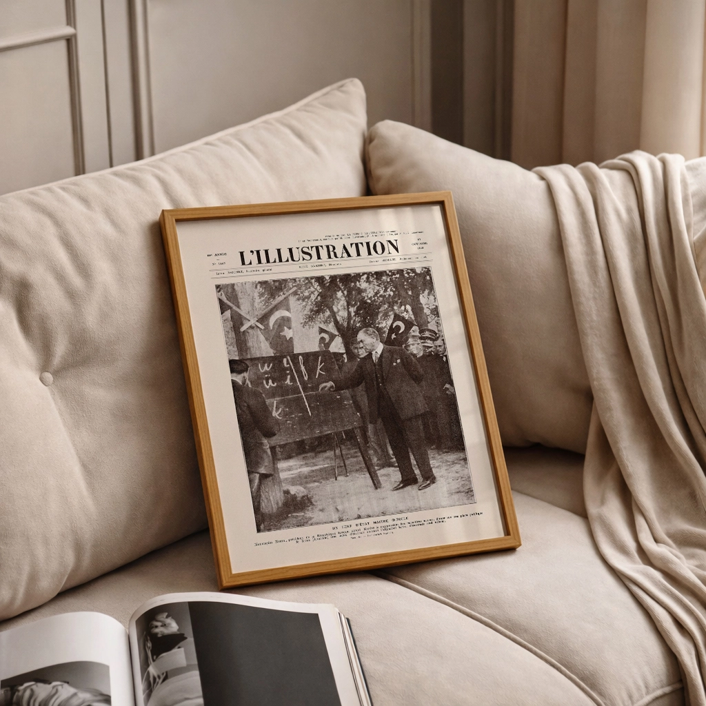 13 Ekim 1928… Fransız L’Illustration dergisinin kapağına taşınan bu ikonik kare, sadece bir fotoğraf değil; bir milletin aydınlanma yolculuğunun en somut nişanı. Mustafa Kemal Atatürk’ün Sivas’ta kara tahta başında yeni Türk harflerini öğrettiği o tarihi an, şimdi Sweetco kalitesiyle yaşam alanlarınıza konuk oluyor.