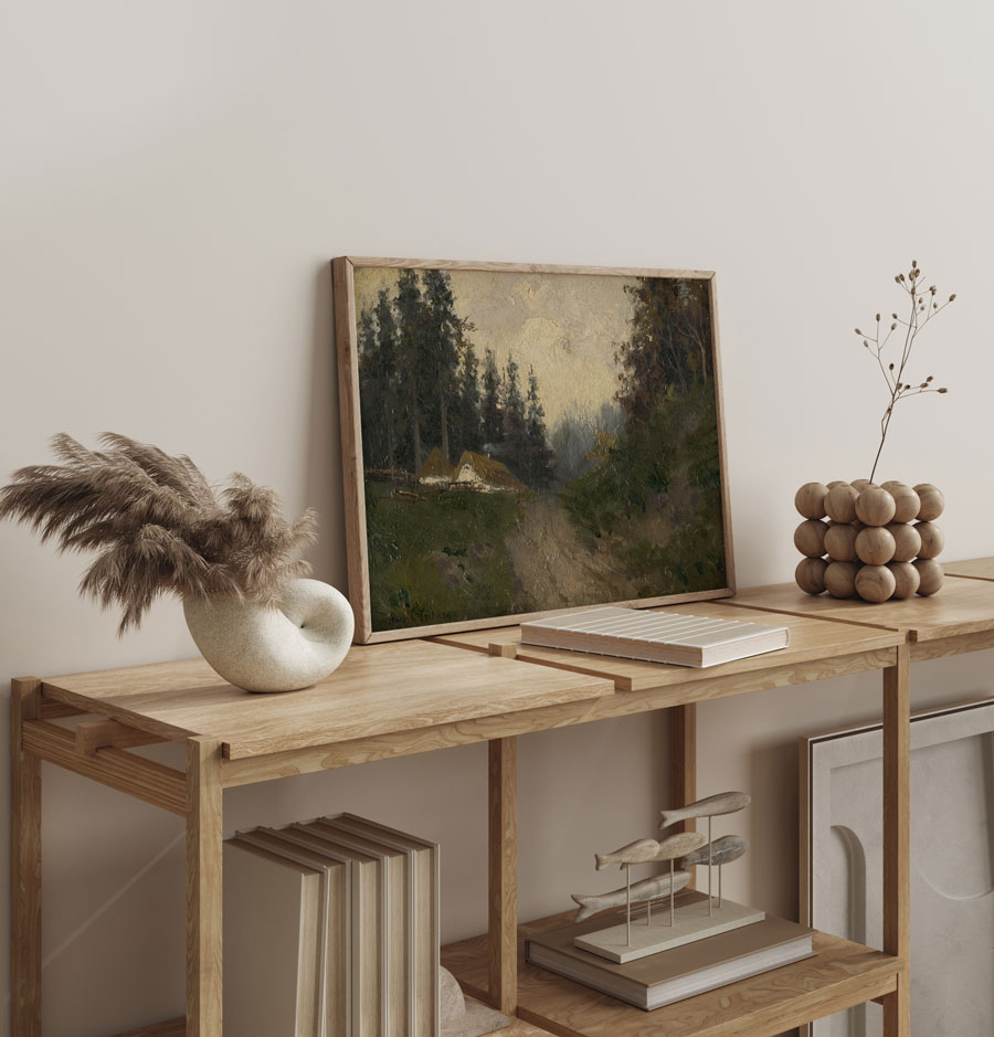 Cottages in The Woods, Felician Moczik’in orman içindeki kırsal yaşamı sade ve atmosferik bir dille ele aldığı etkileyici bir eserdir. Ağaçlarla çevrili evler ve toprak yol, huzur ve dinginlik hissi yaratır. Yumuşak renk geçişleri ve doğal dokular sahneye zamansız bir karakter kazandırır. Rustik, doğal ve sakin dekorasyonlarda güçlü bir uyum sunar.