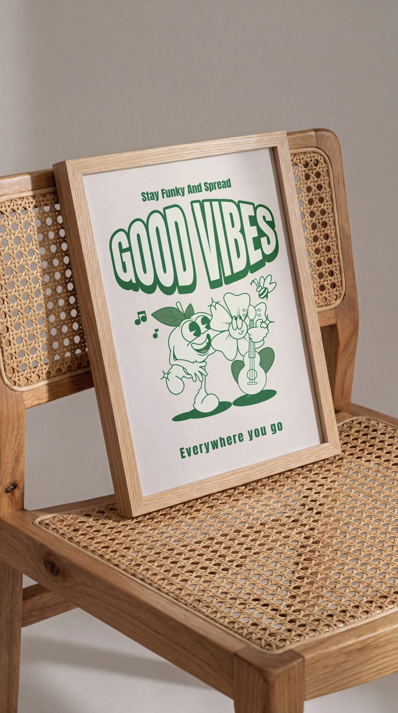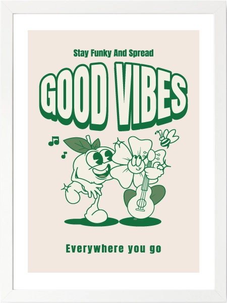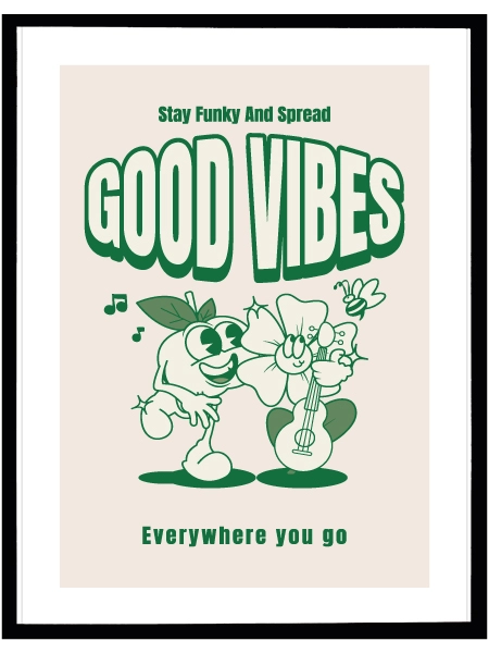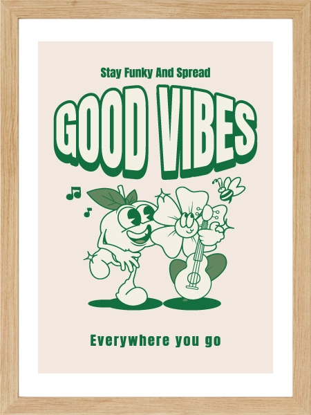 Neşeli karakter çizimi ve “Good Vibes” mesajıyla dikkat çeken bu poster, bulunduğu ortama hafif bir enerji ve pozitif bir hava katar. Abartısız ama karakterli bir parça arıyorsanız tam yerinde bir seçim.
