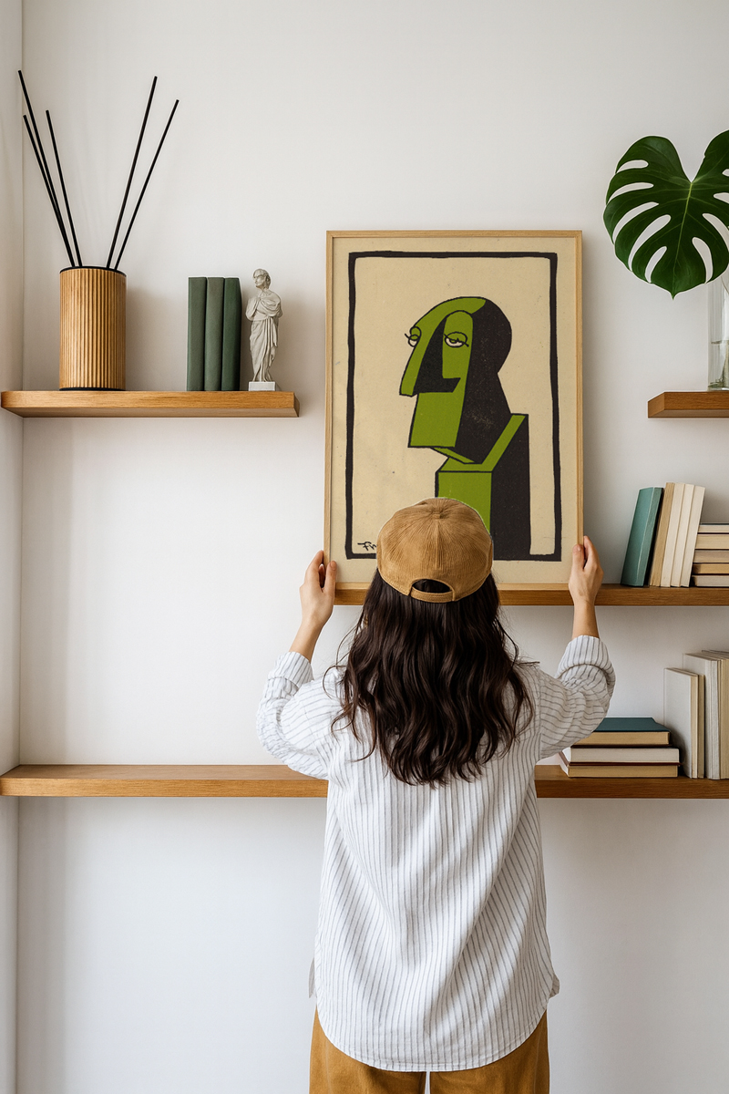 Green Profile, grafik ve modernist sanat anlayışından ilham alan soyut bir portre çalışmasıdır. Yeşil ve siyah blok renklerin dengesiyle düşünceli ve sessiz bir ifade sunar. Minimal formu sayesinde modern ve sanat odaklı mekanlarla kolayca uyum sağlar. Zamansız bir karakter arayanlar için güçlü bir duvar sanatı seçeneğidir.