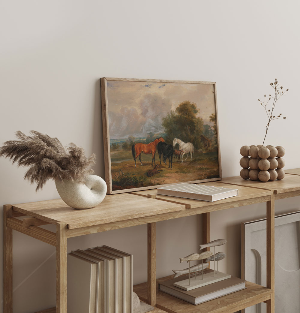 Horses Grazing, açık arazide bir araya gelen atlar ve taylar üzerinden dingin bir kır yaşamını anlatır. Doğal renk geçişleri ve geniş peyzaj, sahneye ferah bir denge kazandırır. Hayvanların rahat duruşu, zamansız ve huzurlu bir atmosfer oluşturur. Doğayla iç içe, sakin mekanlar için yumuşak bir manzara etkisi sunar.