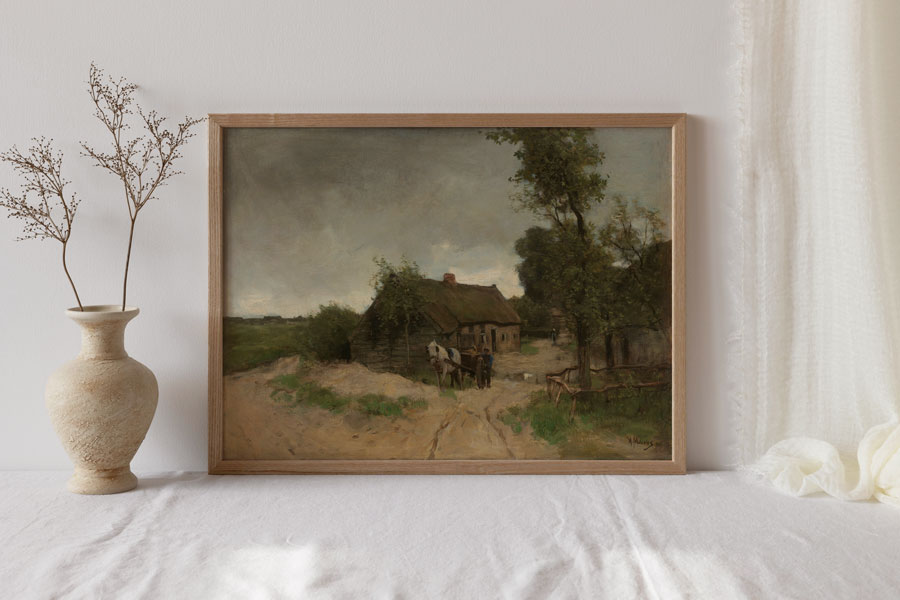 Huisje Aan De Zandweg, doğanın dingin ritmini yumuşak toprak tonlarıyla yansıtır. Ağaçların arasındaki kırsal ev, çevresindeki yol ve yeşillikle huzurlu bir sahne oluşturur. Akıcı fırça darbeleri tabloya samimi bir karakter kazandırır. Sade ve zamansız dekorasyonlar için güçlü bir görsel atmosfer sunar.
