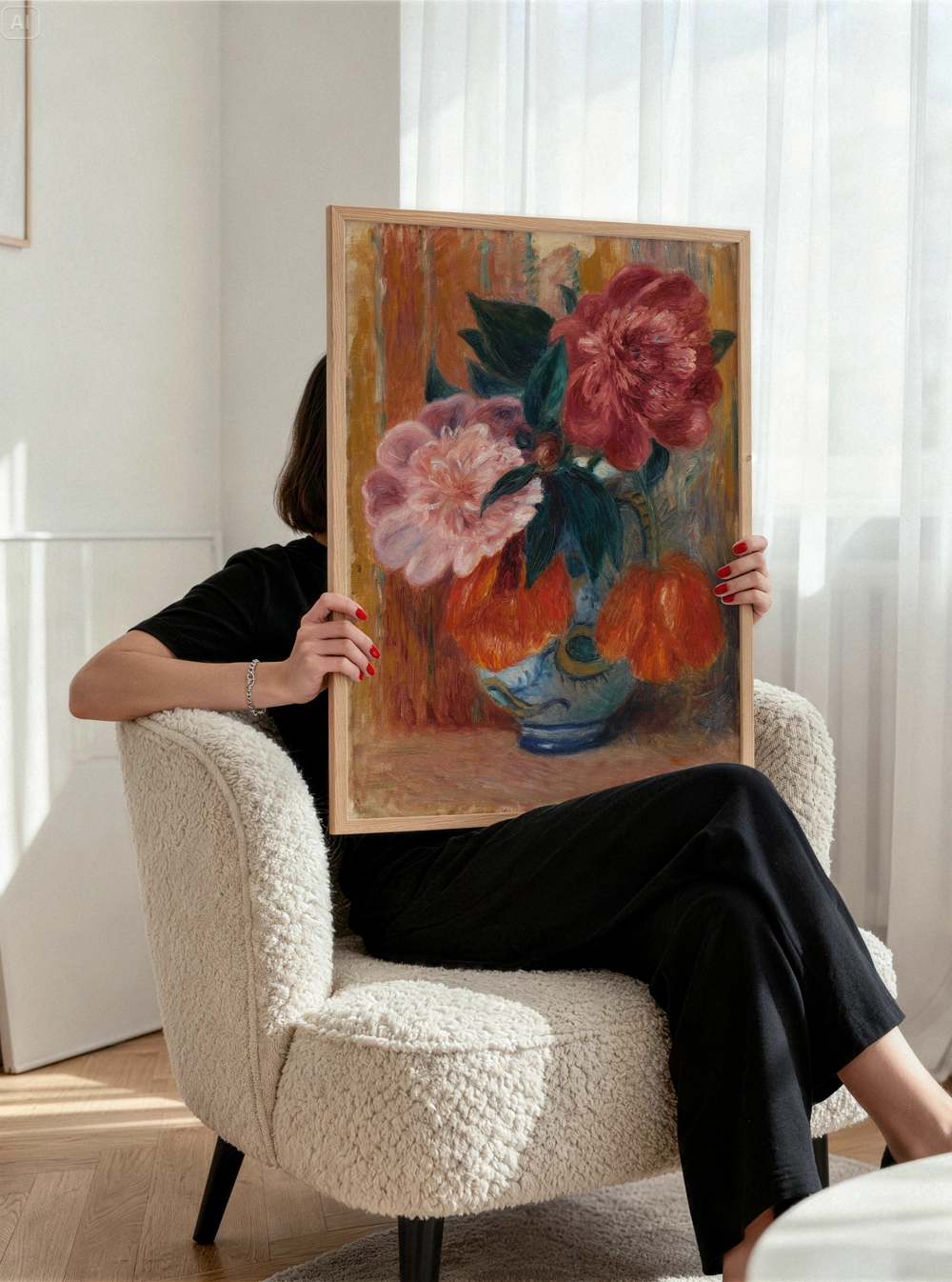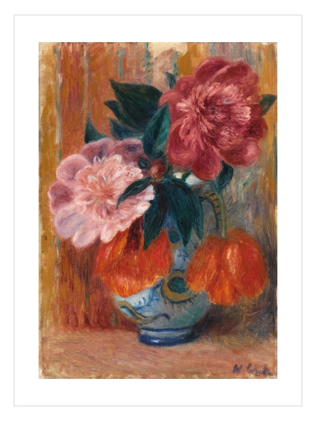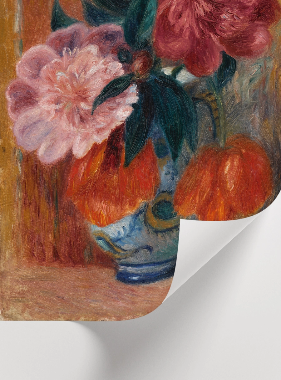 Bu büyüleyici izlenimci poster, dekoratif bir mavi vazo içinde canlı pembe ve derin kırmızı şakayıkları, parlak turuncu çiçeklerle bir araya getiriyor. Sanatçının zengin fırça darbelerini ve dokulu arka planını yansıtan bu natürmort, mekanınıza sanatsal bir sıcaklık ve renk katmak için tasarlanmıştır.