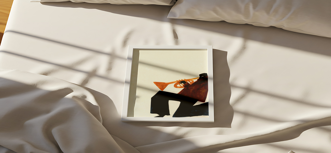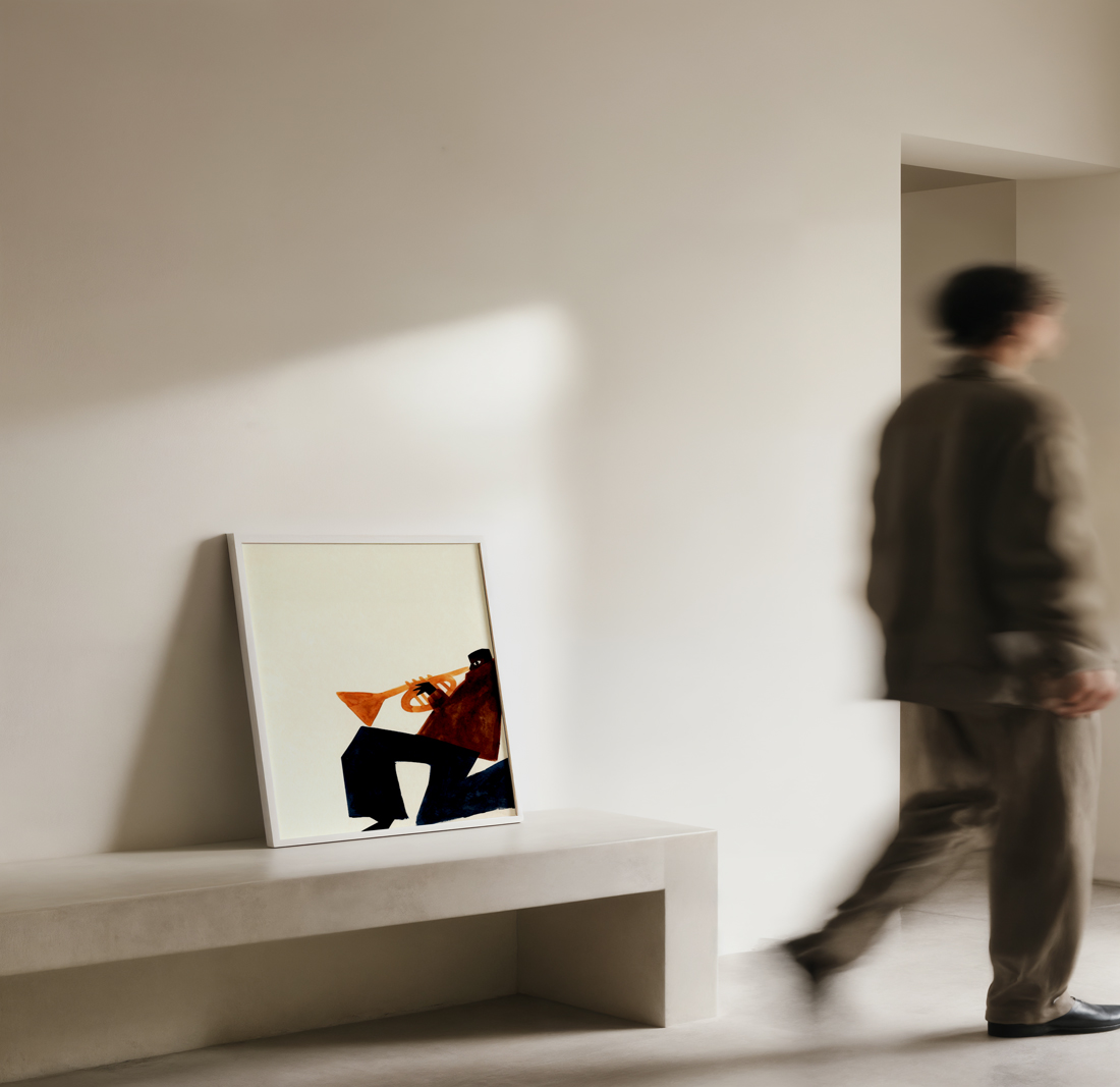 Minimal fırça darbeleriyle oluşturulan bu illüstrasyon, caz müziğin ritmini sade bir kompozisyonla yansıtır. Sıcak kahve ve lacivert tonları görsele derinlik katar. Modern ve sanatsal mekanlar için ideal bir seçimdir.