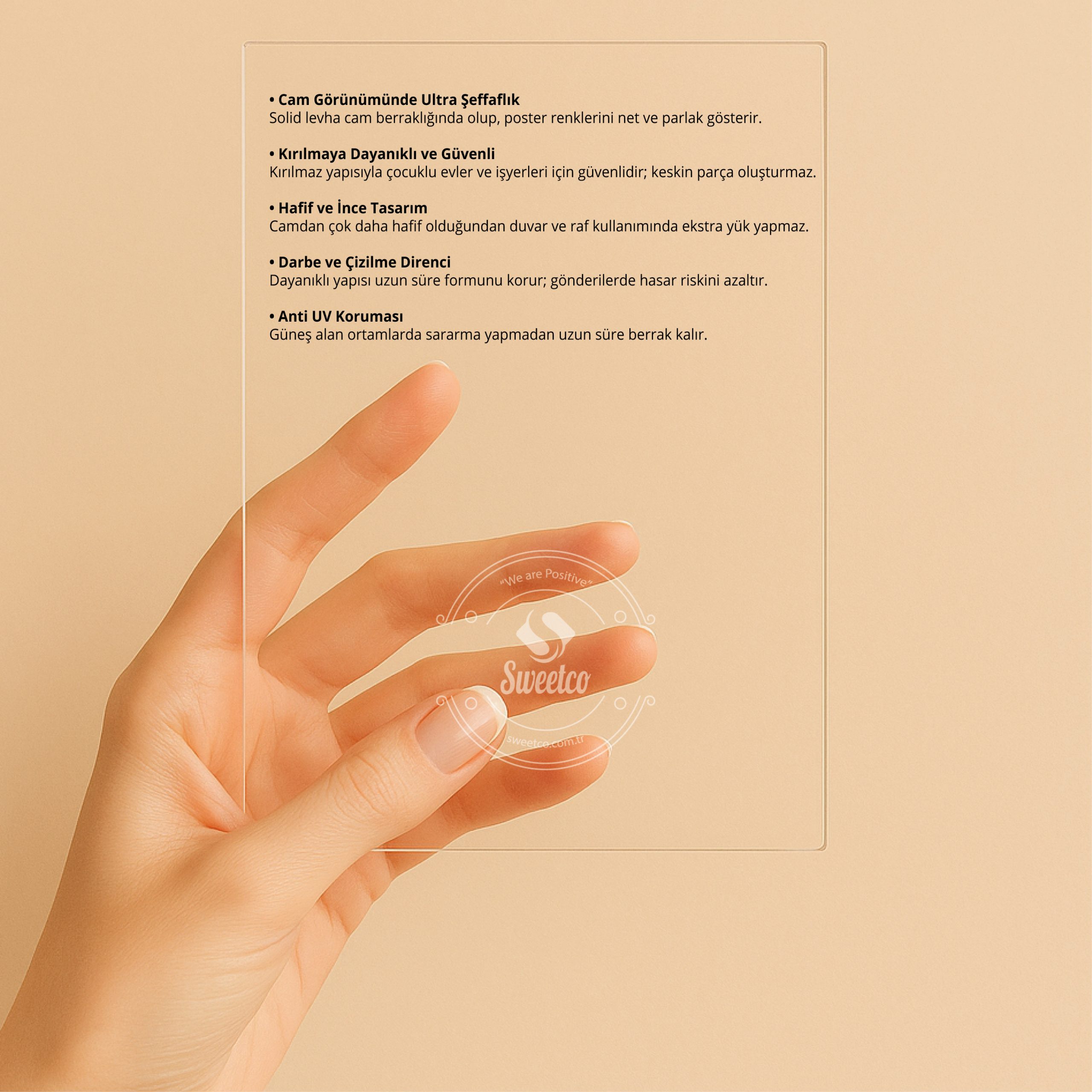 Minimal profili, posterin ön planda kalmasını sağlar. Cam görünümlü, hafif ve kırılmaya dayanıklı solid polycarbon ön koruma ile güvenli kullanım sunar.