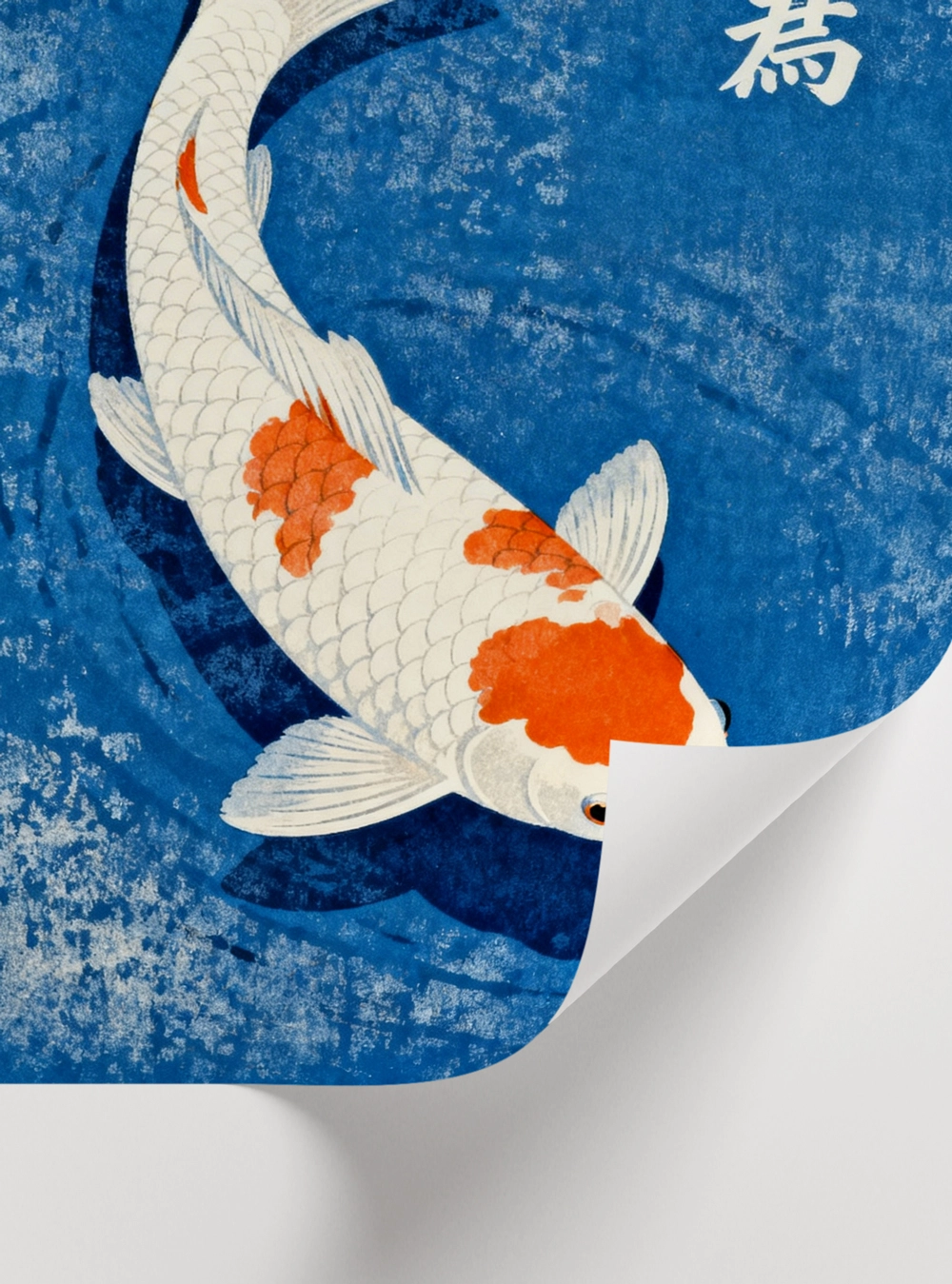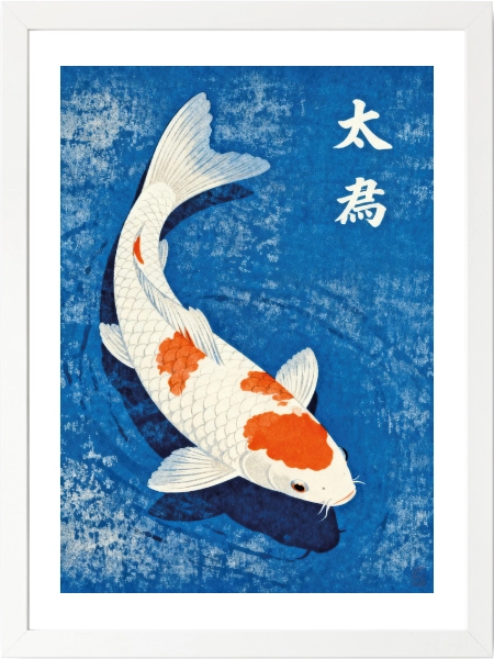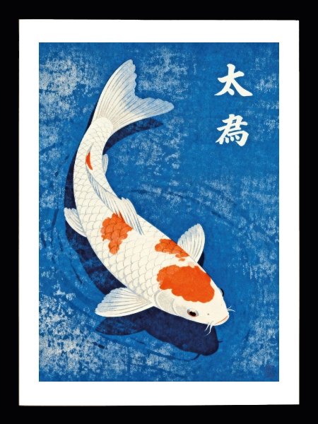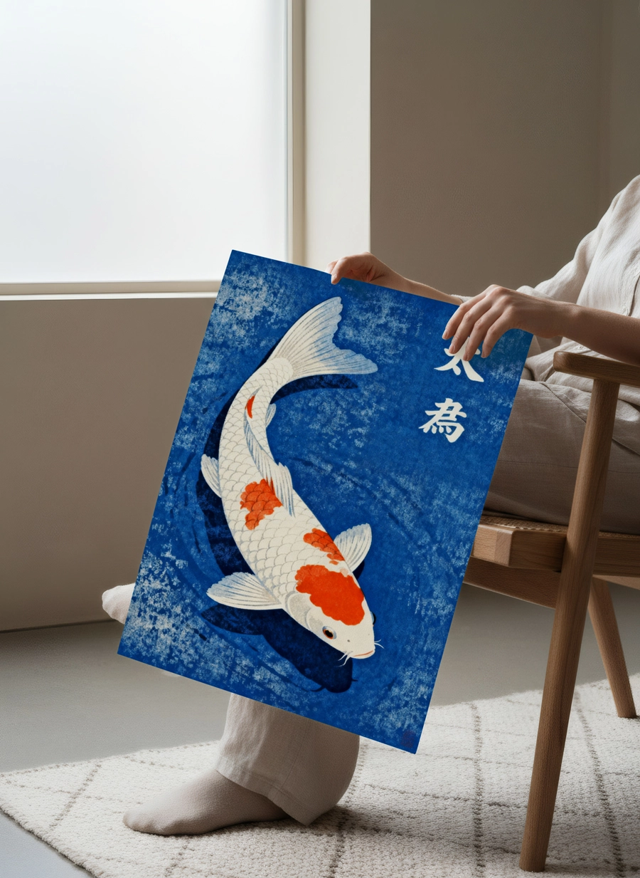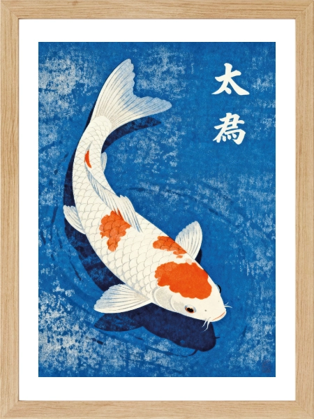 Mavi fon üzerinde yüzmekte olan koi balığını gösteren bu Japon sanat posteri, güç ve azmin sembolü olan koi figürü ile dikkat çeker. Posterde yer alan Japonca “大為” kanjisi ise “büyük amaç” ve “büyük başarı için çaba” anlamını simgeler. Dengeli kompozisyonu sayesinde dekorasyona huzurlu ve estetik bir atmosfer kazandırır.