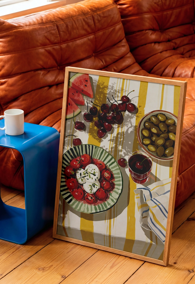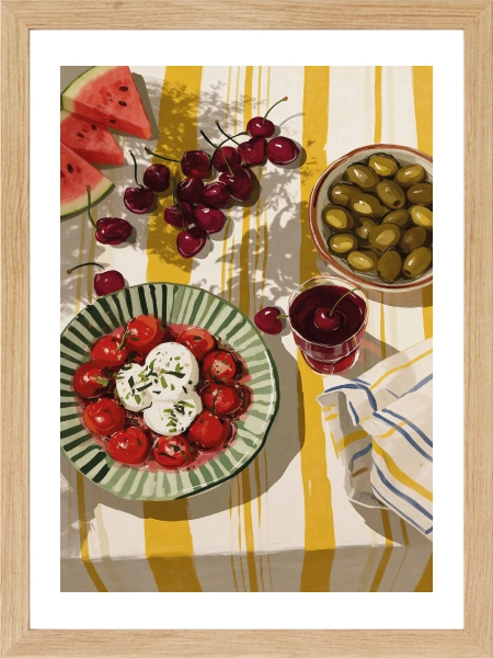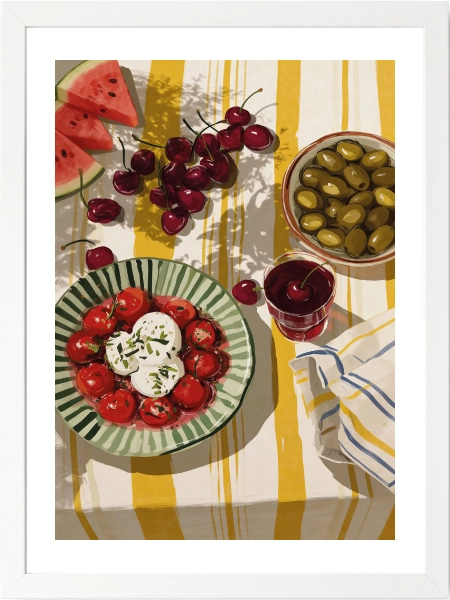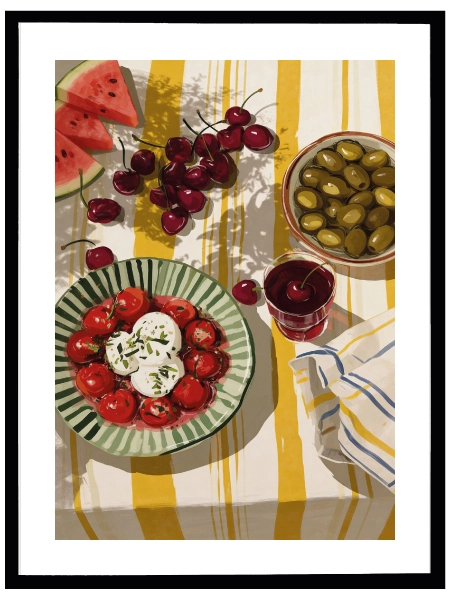 Yazın neşesini ve Akdeniz mutfağının tazeliğini duvarlarınıza taşıyın. Sarı ve yeşilin canlı tonlarıyla bezenmiş bu sofra illüstrasyonu, mutfağınıza veya yemek köşenize sıcak ve davetkar bir atmosfer katar. Karpuzdan kiraza, zeytinden mozarellaya kadar her detayıyla bir yaz pikniğini anımsatan bu tasarım, hem modern hem de rustik dekorasyon stilleriyle kusursuz bir uyum sağlar. Gurme ruhlar ve renkli dekorasyon severler için harika bir parça!