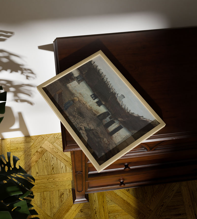 Outside a Homestead, kırsal yaşamın sade ve dingin atmosferini yalın bir anlatımla yansıtan etkileyici bir eserdir. Toprak tonları, taş zemin ve mütevazı yapı detayları huzurlu bir günlük hayat sahnesi sunar. Figürün mekana kattığı insan dokunuşu, kompozisyonu daha samimi hale getirir. Doğal ve rustik dekorasyonlarda sıcak bir karakter oluşturur.