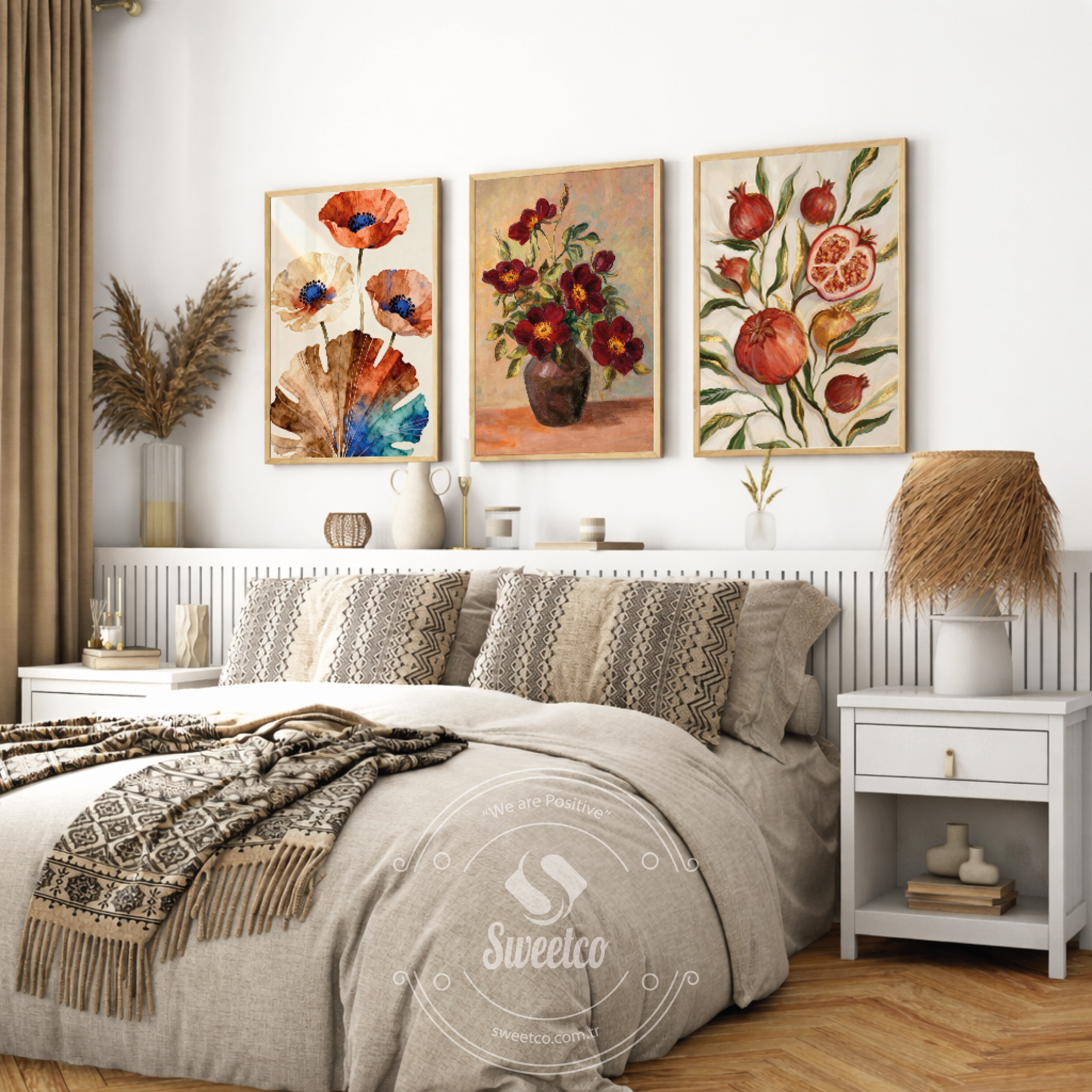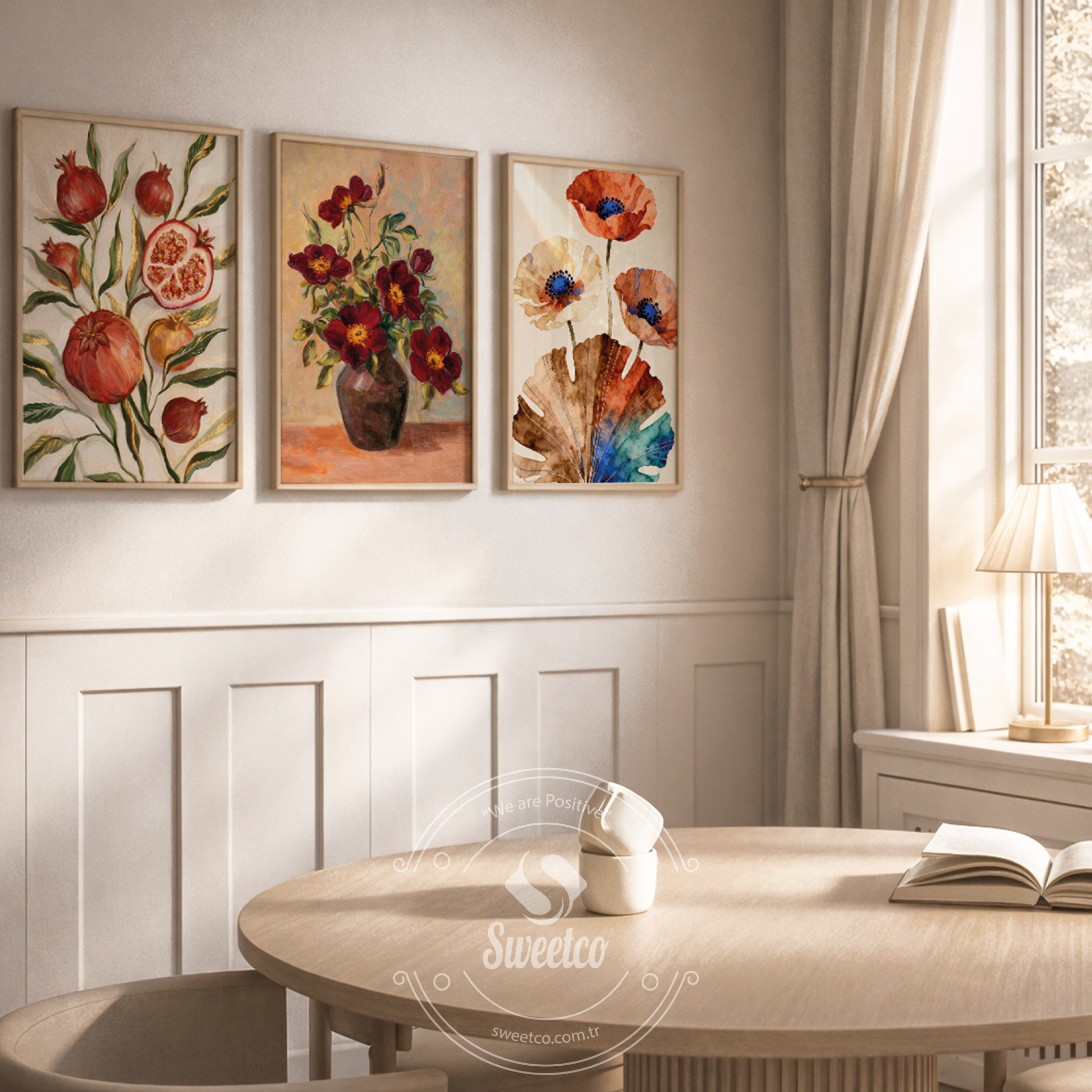 Quiet Bloom Set, nar ve gelincik çiçeklerinden ilham alan sıcak tonlarıyla mekana huzurlu bir atmosfer kazandırır. Doğal dokular ve yumuşak renk geçişleriyle dengeli bir görünüm sunar. Minimal ve modern dekorasyonlarda zarif bir vurgu oluşturur. Yemek odası, salon ve çalışma alanları için zamansız bir seçenektir.