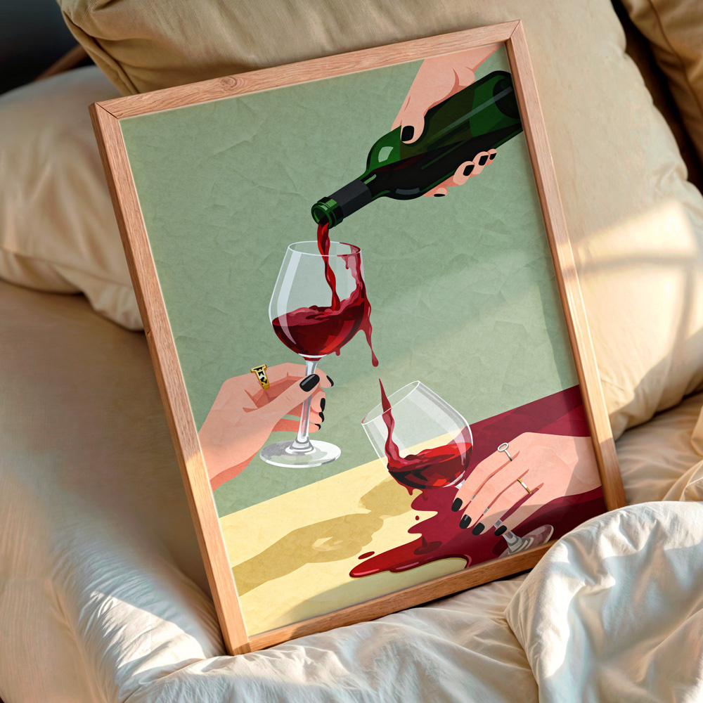 Red Wine Ritual Poster, kırmızı şarabın ritüelini ve paylaşım anlarını betimleyen modern bir illüstrasyondur. Cesur renkler, akışkan formlar ve sade kompozisyonuyla duyguyu ön plana çıkarır. Sanatsal ve karakterli dekorasyonlar için güçlü bir duvar sanatı seçeneğidir.