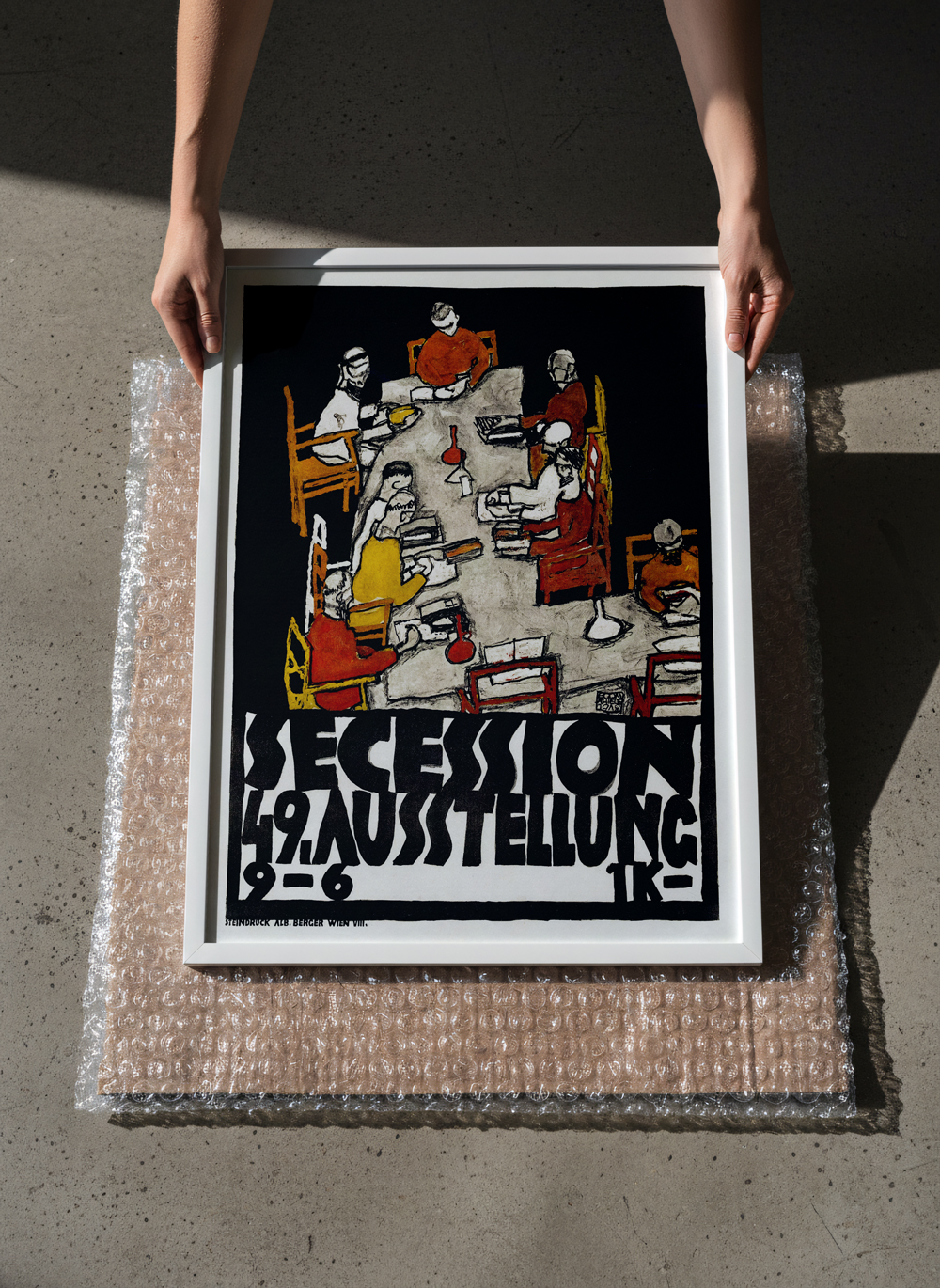 Bu poster, Egon Schiele tarafından 49. Secession Sergisi için tasarlanan ikonik sergi afişini yansıtır. Figüratif anlatım, güçlü konturlar ve dramatik renk kontrastları dönemin avangart ruhunu ortaya koyar. Kompozisyon, modern sanatın erken dönem estetik arayışlarını yansıtan çarpıcı bir görsel etki sunar. Sanat tarihi, ekspresyonizm ve klasik sergi afişlerine ilgi duyan mekanlar için karakterli bir duvar dekorudur.