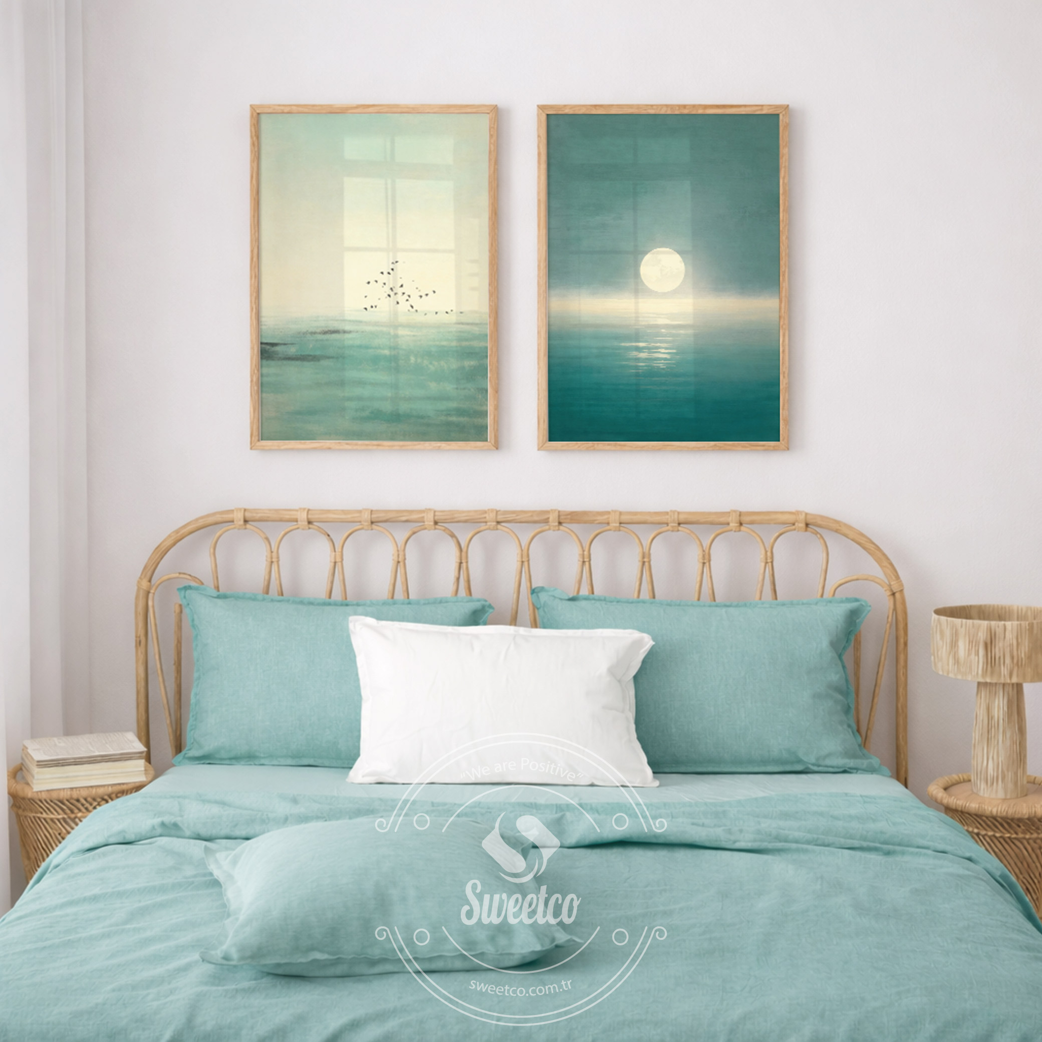 Silent Moonlight Set, ay ışığı ve deniz temasını bir araya getiren çerçeveli poster tablo duvar dekorasyonu setidir. Yumuşak mavi ve yeşil tonlarıyla yatak odası ve salonlarda sakin, dengeli bir atmosfer oluşturur.