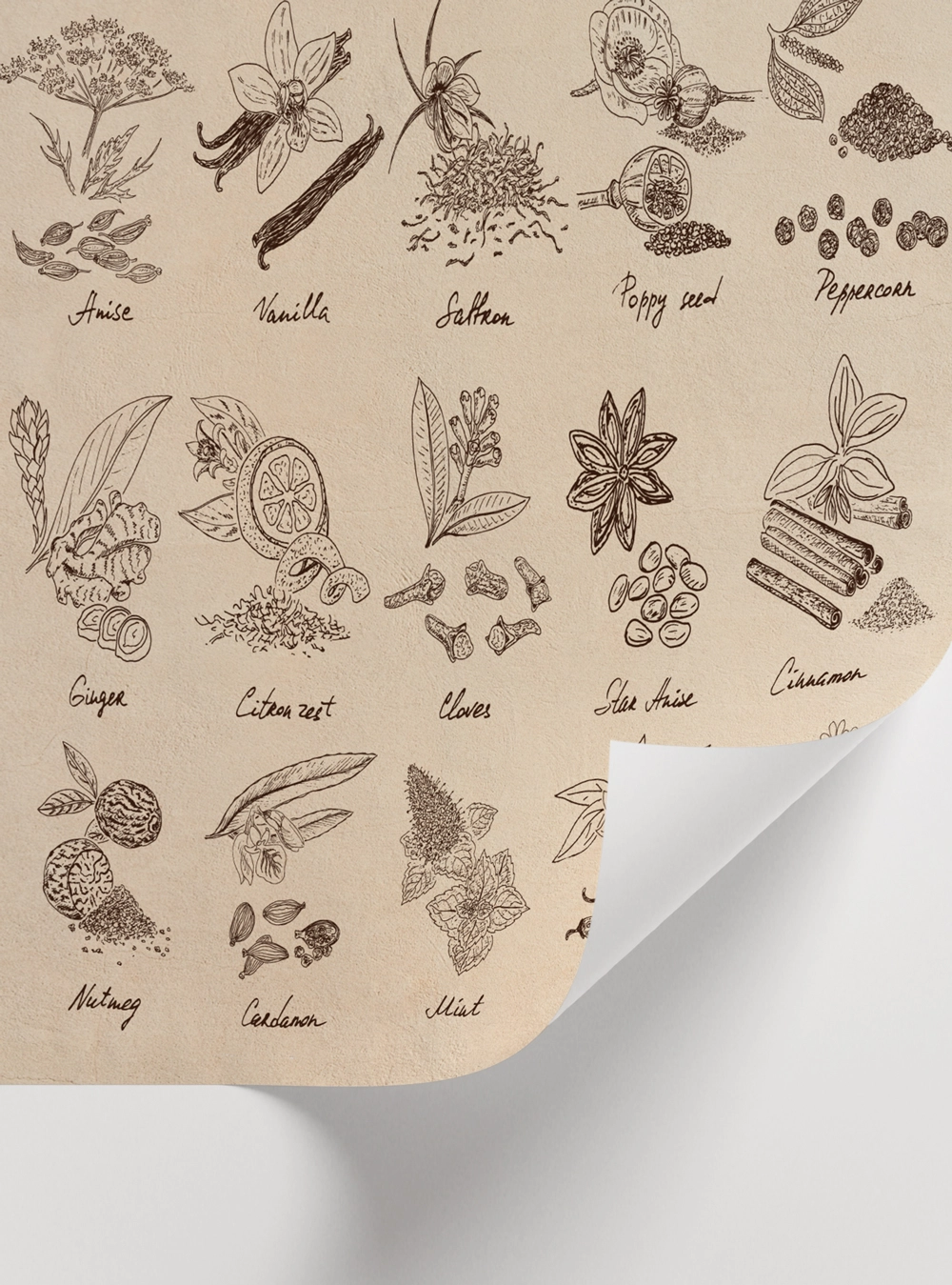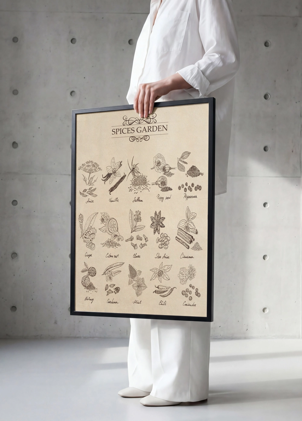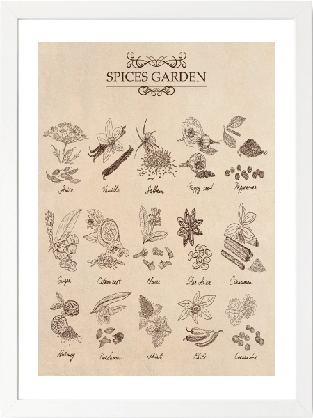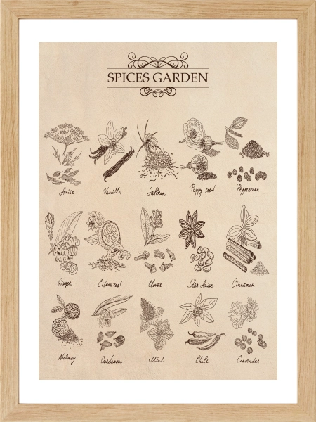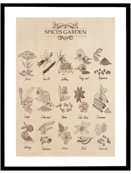 Spices Garden Poster, mutfak dekorasyonuna sıcak ve nostaljik bir hava katmak isteyenler için tasarlanmış vintage baharat temalı dekoratif posterdir. Tarçın, vanilya, safran, yıldız anason ve daha birçok baharat illüstrasyonu içerir. Çerçeveli ve çerçevesiz seçeneklerle sunulur.
