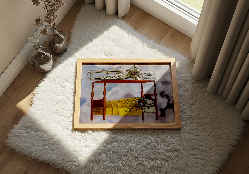 Frida Kahlo’nun The Dream eseri, yaşam, ölüm ve bilinçaltı temalarını güçlü sembollerle bir araya getirir. Yatak sahnesi üzerinden kurulan kompozisyon, sanatçının iç dünyasını ve kırılganlığını yansıtır. Doğal unsurlar ile metafizik imgelerin birleşimi, izleyicide derin bir duygusal etki bırakır. Sürrealist anlatımı sevenler için çarpıcı ve anlam yüklü bir duvar sanatı seçeneğidir.