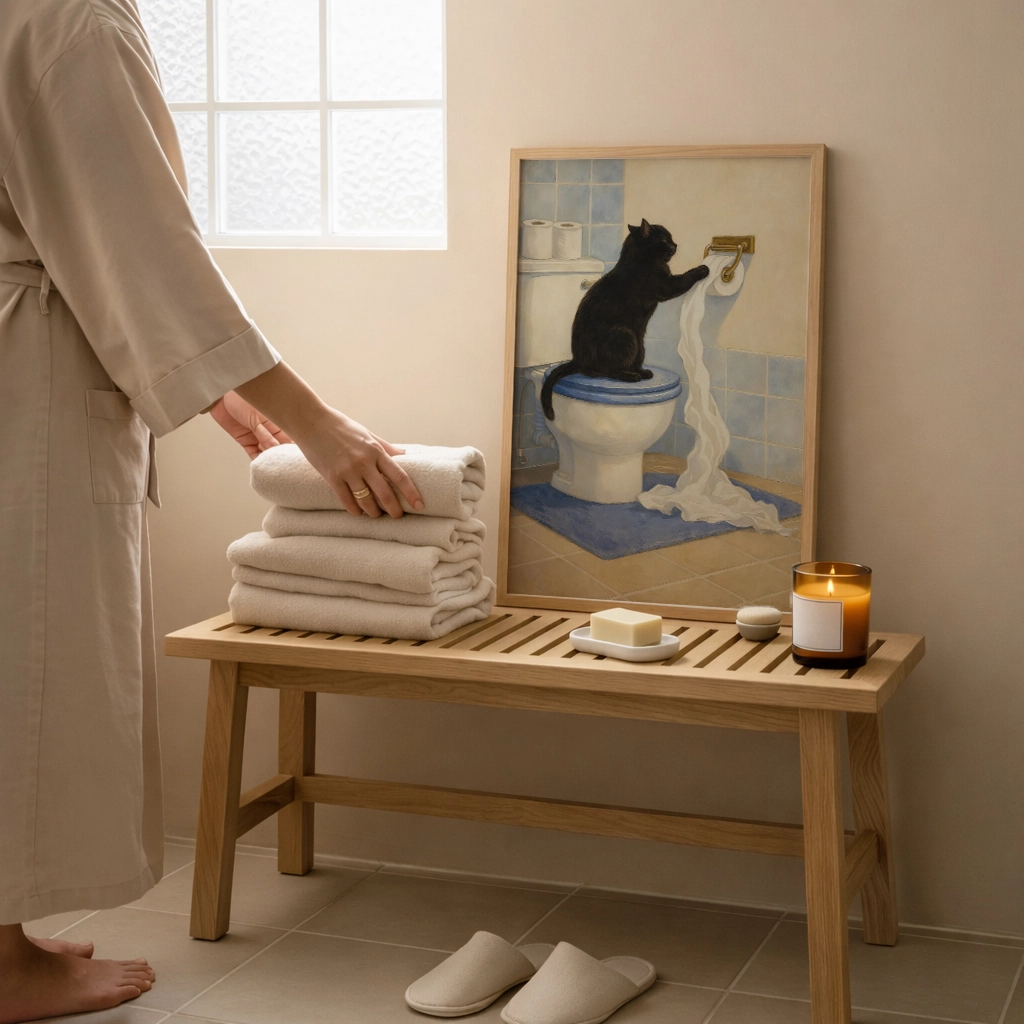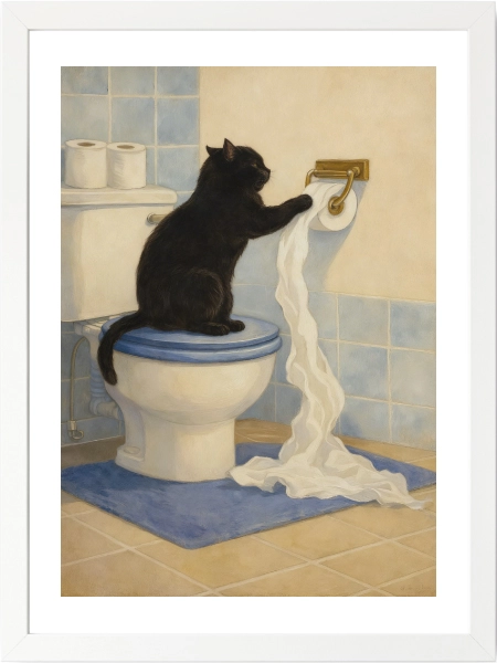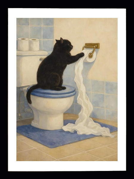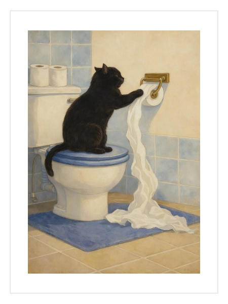 Meraklı kara kedi tuvalet kağıdıyla oynarken… Toilet Paper Bandit posteri banyolara eğlenceli ve mizahi bir karakter kazandırır. Günlük hayatın komik anlarından ilham alan sıcak bir tasarım.