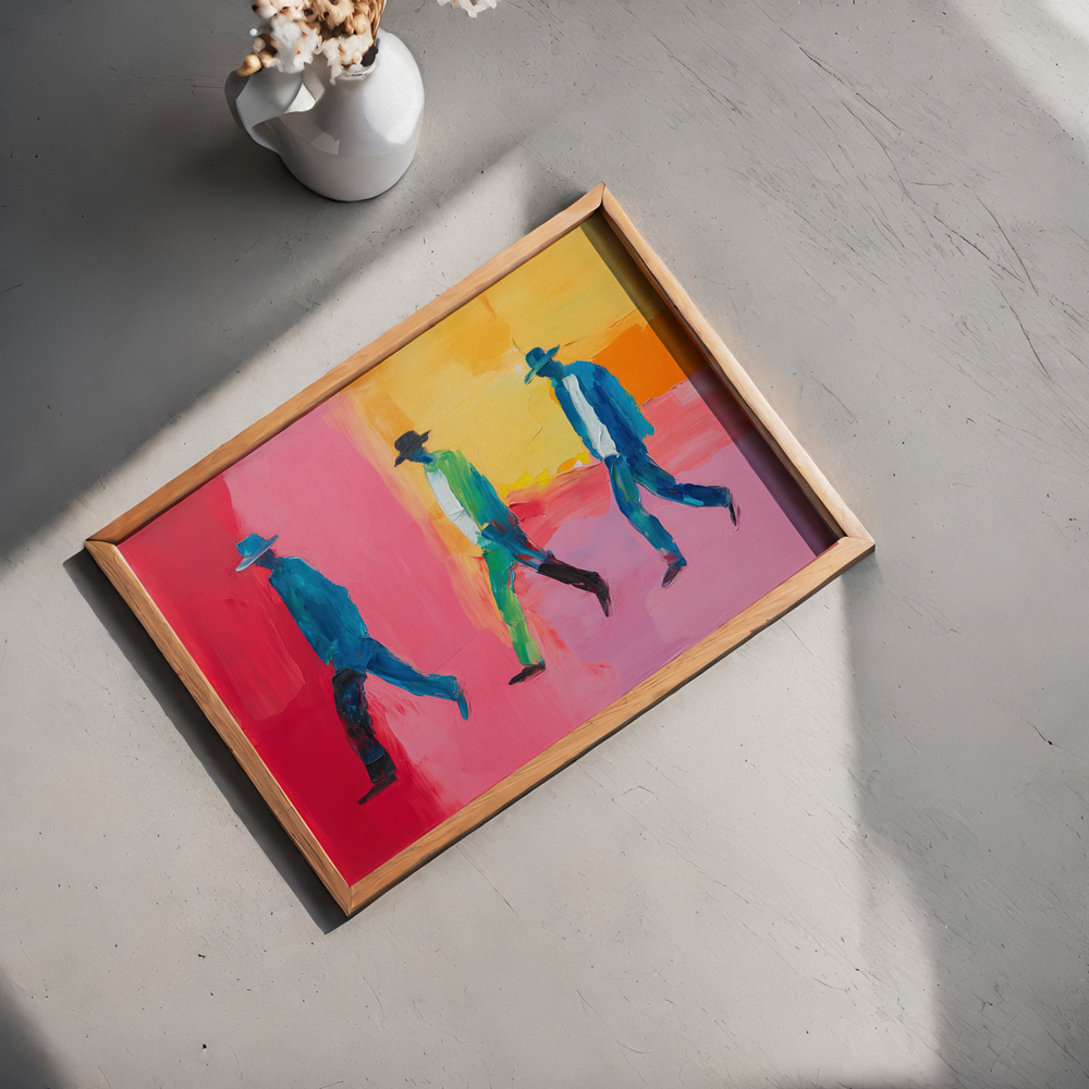 Canlı renklerin dinamizmiyle oluşturulan bu soyut yürüyen figür posteri, modern dekorlara hareket ve enerji katar. Cesur fırça darbeleriyle oluşturulan kompozisyon, mekanlara sanatsal bir vurgu ekler.