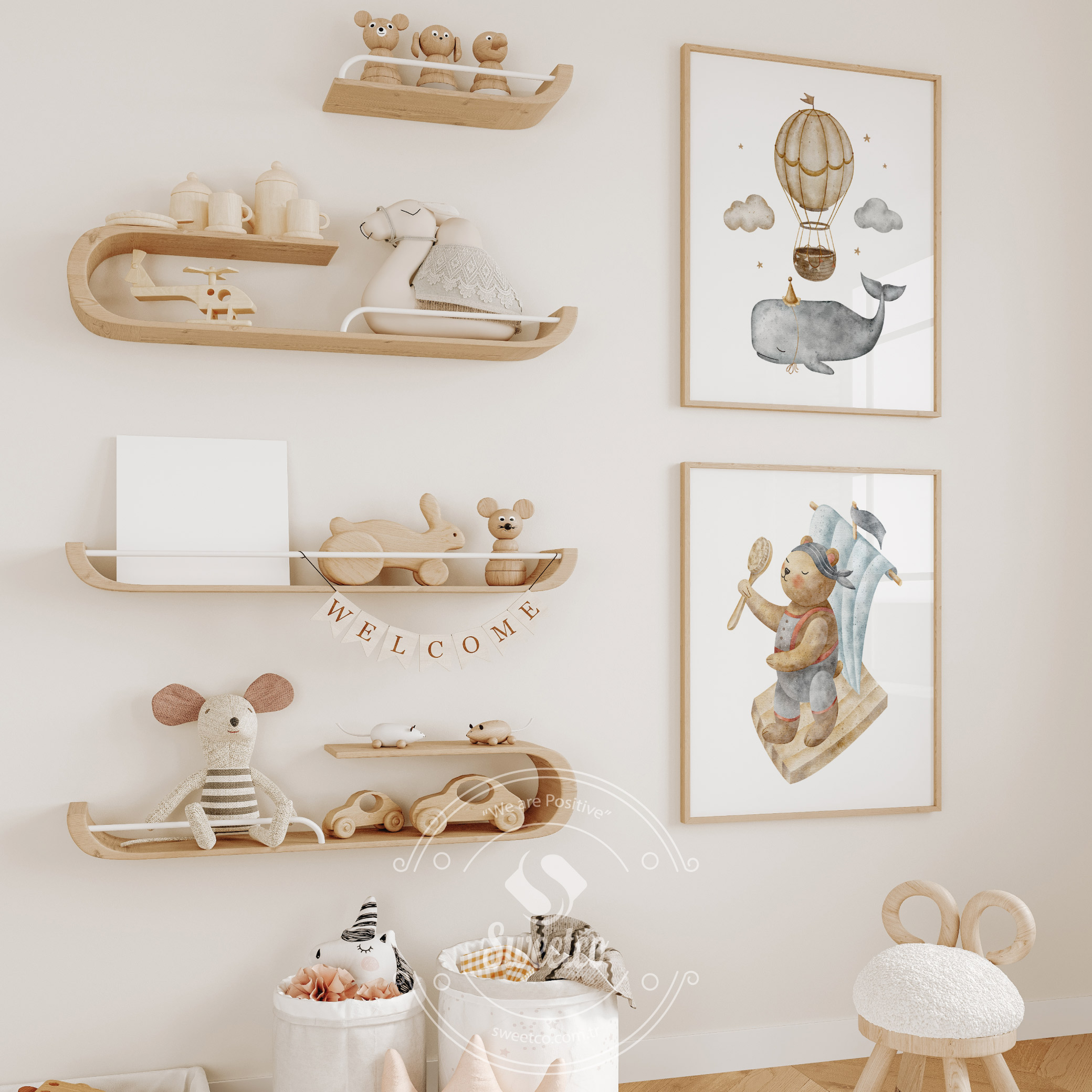 Balonlu balina ve kaptan ayıcığın sevimli illüstrasyonlarıyla sıcak ve huzurlu bir atmosfer oluşturur. Yumuşak pastel tonları sayesinde hem kız hem erkek bebek odalarına uyum sağlar. Duvarlara masalsı bir dokunuş katar ve mekanın genel ambiyansını yumuşatır.