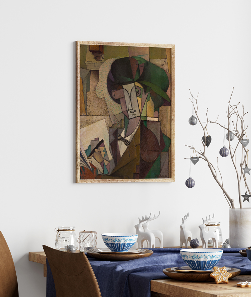 Young Man with a Fountain Pen Poster, Diego Rivera’nın erken dönem kübist üslubunu yansıtan dikkat çekici bir portresidir. Parçalı formlar, geometrik yüzeyler ve dengeli renk kullanımı, figürün düşünsel derinliğini ön plana çıkarır. Sanatçının klasik anlatımdan modern yoruma geçiş sürecini temsil eder. Sanat ve modern dekorasyon sevenler için güçlü bir duvar sanatı seçeneğidir.